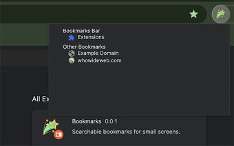 Bookmarksは、小さな画面でのブックマークの整理を強化するために設計された無料のChrome拡張機能です。このツールは、拡張機能メニューアイコンをクリックすることでユーザーが便利にブックマークを一覧表示できるようにし、お気に入りのサイトに迅速にアクセスできるようにします。この拡張機能は、特に多数のブックマークを頻繁にナビゲートするユーザーにとって有益で、画面スペースを圧迫することなくブラウジング体験を効率化します。